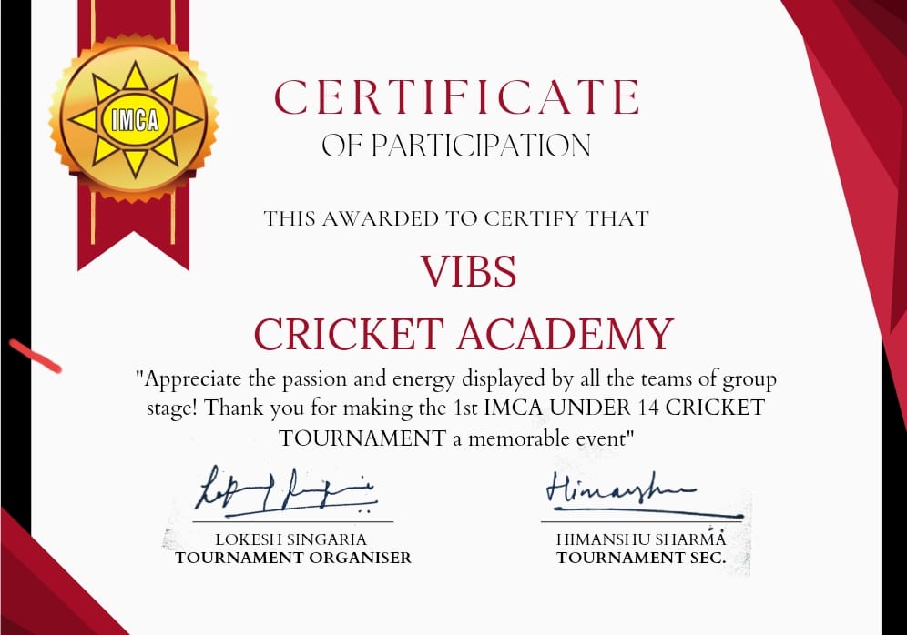 VIBS Cricket Academy –Certificate of Achievement, appreciates the passion and energy displayed by the team in the group stage